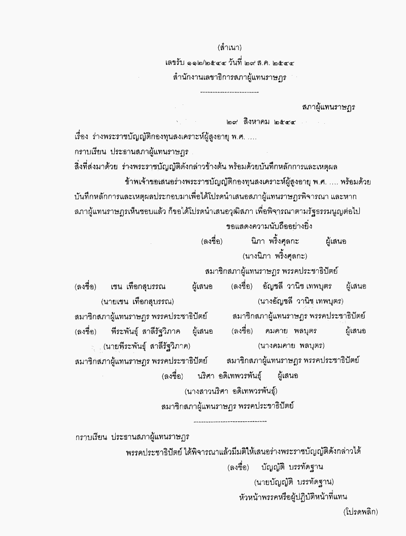 • ร่างพระราชบัญญัติกองทุนสงเคราะห์ผู้สูงอายุ พ.ศ..... (นางนิภา พริ้งศุลกะ กับคณะ เป็นผู้เสนอ) (เป็นร่างพระราชบัญญัติที่มีสาระเกี่ยวกับคนชรา ตามมาตรา 190 ของรัฐธรรมนูญแห่งราชอาณาจักรไทย)
