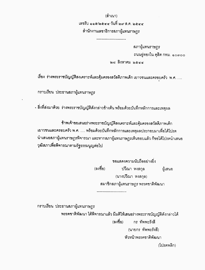 ชื่อเอกสาร :   ร่างพระราชบัญญัติสงเคราะห์และคุ้มครองสวัสดิภาพเด็ก เยาวชนและครอบครัว พ.ศ..... (นางปวีณา หงสกุล เป็นผู้เสนอ) (เป็นร่างพระราชบัญญัติที่มีสาระเกี่ยวกับเด็ก ตามมาตรา 190 ของรัฐธรรมนูญแห่งราชอาณาจักรไทย)