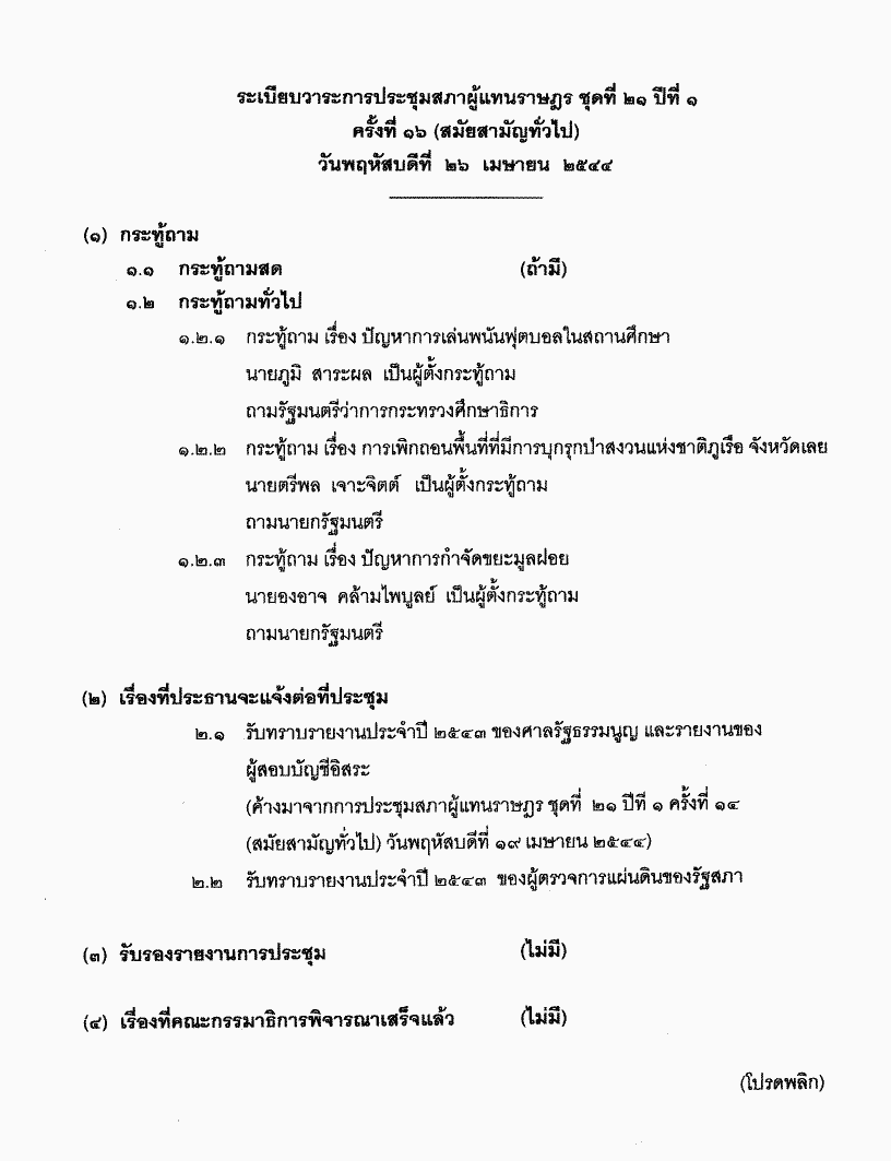 • ระเบียบวาระการประชุมสภาผู้แทนราษฎร ชุดที่ ๒๑ ปีที่ ๑ ครั้งที่ ๑๖ (สมัยสามัญทั่วไป) วันพฤหัสบดีที่ ๒๖ เมษายน ๒๕๔๔