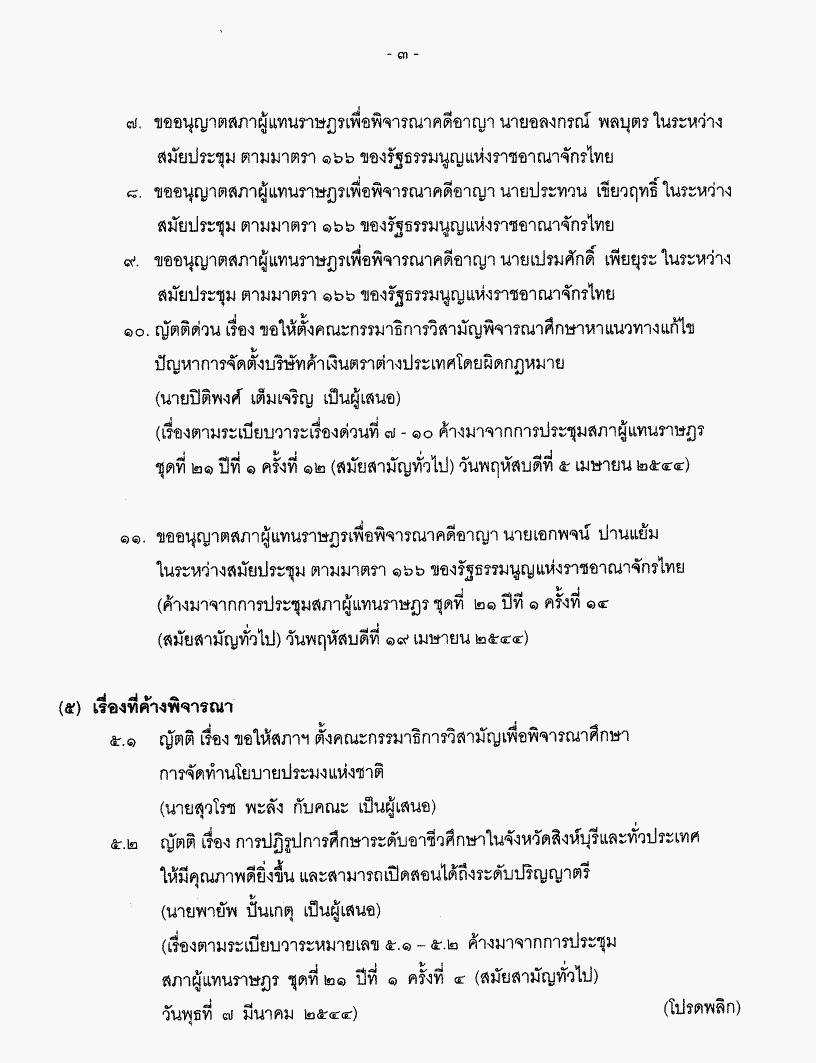 • ระเบียบวาระการประชุมสภาผู้แทนราษฎร ชุดที่ ๒๑ ปีที่ ๑ ครั้งที่ ๑๖ (สมัยสามัญทั่วไป) วันพฤหัสบดีที่ ๒๖ เมษายน ๒๕๔๔