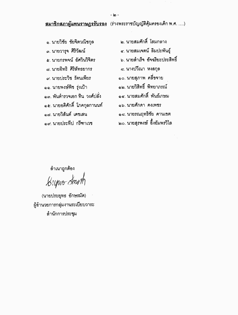 • ร่างพระราชบัญญัติคุ้มครองเด็ก พ.ศ..... (นายประสิทธิ์ ชัยวิรัตนะ และนายศรคม ฦๅชา เป็นผู้เสนอ)(เป็นร่างพระราชบัญญัติที่มีสาระเกี่ยวกับเด็ก ตามมาตรา 190 ของรัฐธรรมนูญแห่งราชอาณาจักรไทย)