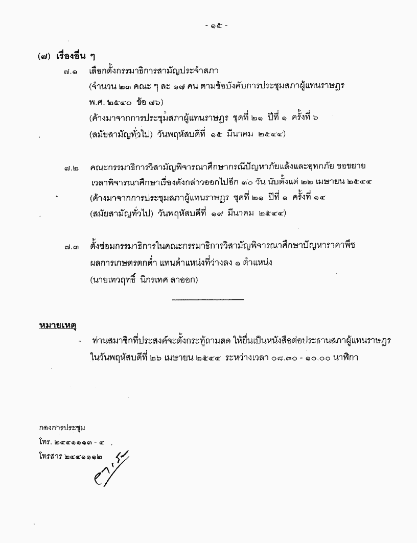 • ระเบียบวาระการประชุมสภาผู้แทนราษฎร ชุดที่ ๒๑ ปีที่ ๑ ครั้งที่ ๑๖ (สมัยสามัญทั่วไป) วันพฤหัสบดีที่ ๒๖ เมษายน ๒๕๔๔
