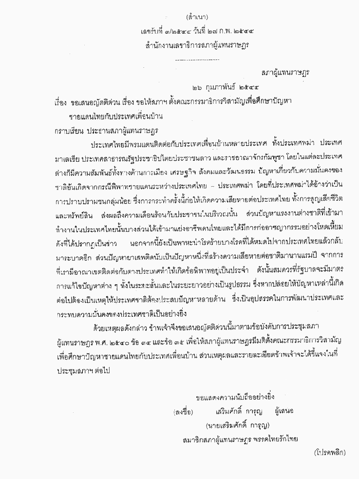 • ขอเสนอญัตติด่วน เรื่อง ขอให้สภาฯ ตั้งคณะกรรมาธิการวิสามัญเพื่อศึกษาปัญหาชายแดนไทยกับประเทศเพื่อนบ้าน