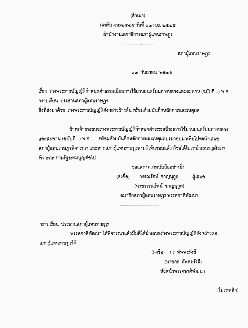 • ร่างพระราชบัญญัติกำหนดค่าธรรมเนียมการใช้ยานยนตร์บนทางหลวงและสะพาน (ฉบับที่..) พ.ศ..... (นายวรรณรัตน์ ชาญนุกูล เป็นผู้เสนอ)