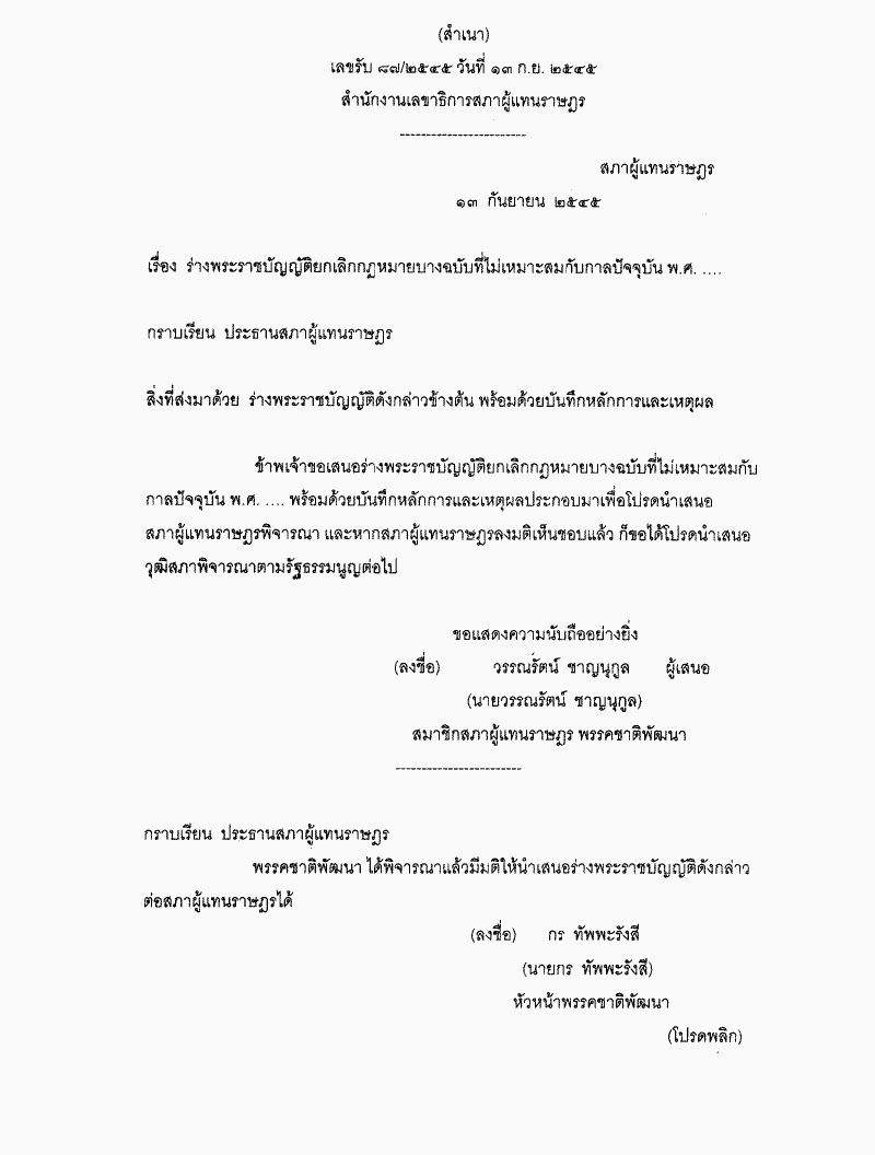 • ร่างพระราชบัญญัติยกเลิกกฎหมายบางฉบับที่ไม่เหมาะสมกับกาลปัจจุบัน พ.ศ..... (นายวรรณรัตน์ ชาญนุกูล เป็นผู้เสนอ)