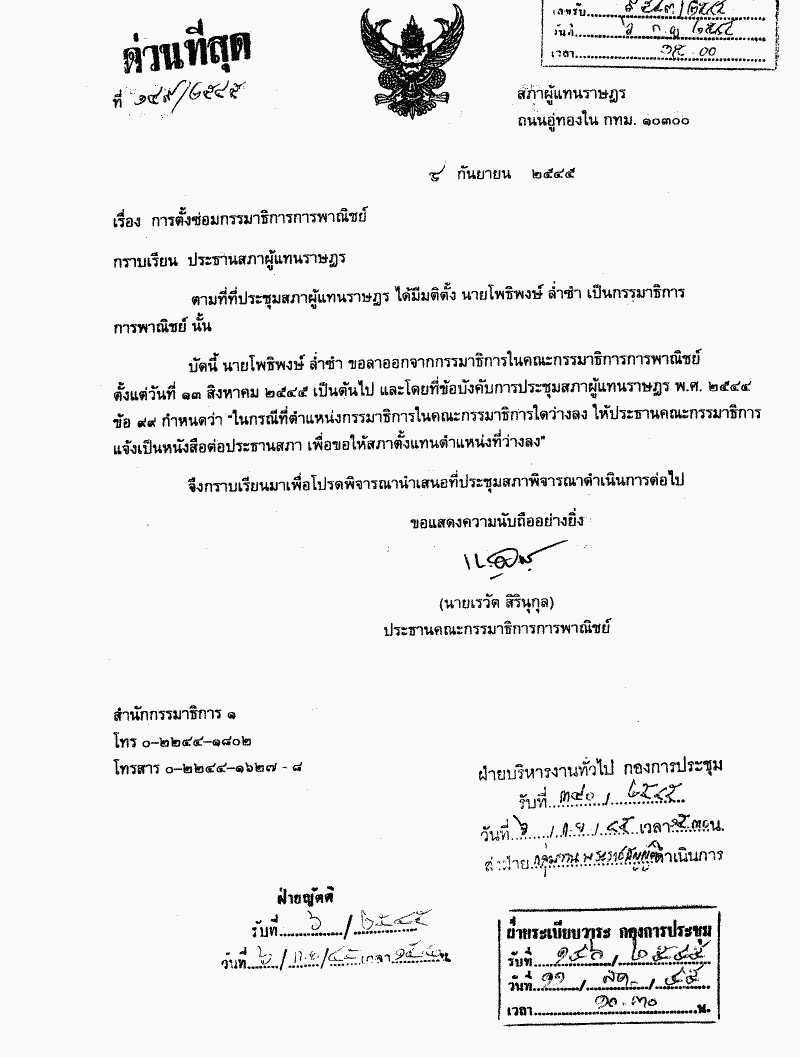 ตั้งซ่อมกรรมาธิการสามัญประจำสภา ในคณะกรรมาธิการการพาณิชย์ แทนตำแหน่งที่ว่างลง 1 ตำแหน่ง เพราะลาออก (นายโพธิพงษ์ ล่ำซำ) |