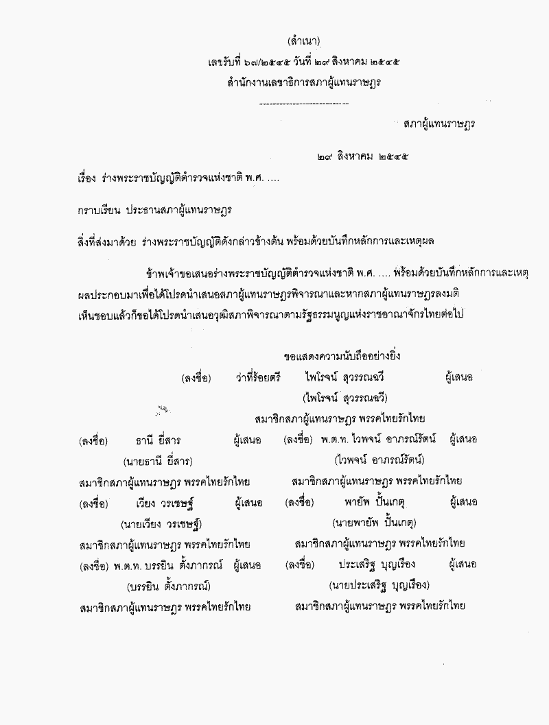 ร่างพระราชบัญญัติตำรวจแห่งชาติ พ.ศ..... (ว่าที่ร้อยตรีไพโรจน์ สุวรรณฉวี กับคณะ เป็นผู้เสนอ)