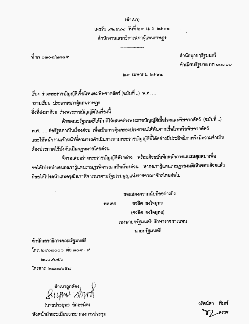 • ร่างพระราชบัญญัติเชื้อโรคและพิษจากสัตว์ (ฉบับที่ ..) พ.ศ. .... (คณะรัฐมนตรี เป็นผู้เสนอ)