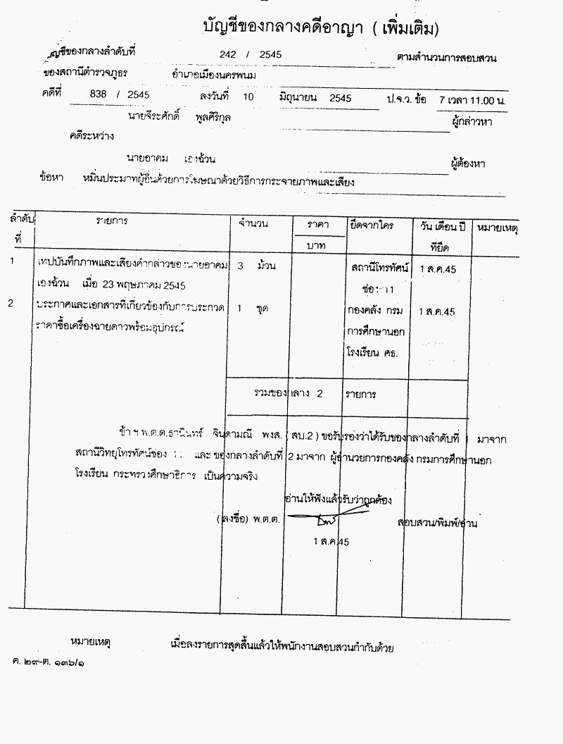 • ขออนุญาตเรียกตัวสมาชิกสภาผู้แทนราษฎรมาทำการสอบสวนในคดีอาญา