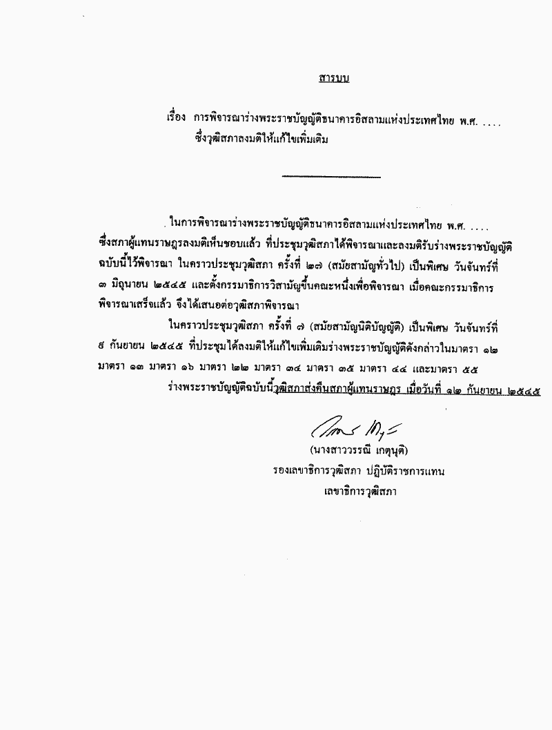 ชื่อเอกสาร :   พิจารณากรณีวุฒิสภาแก้ไขเพิ่มเติมร่างพระราชบัญญัติธนาคารอิสลามแห่งประเทศไทย พ.ศ..... ตามมาตรา 175 ของรัฐธรรมนูญแห่งราชอาณาจักรไทย