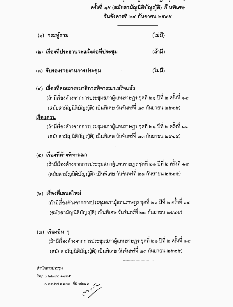 ระเบียบวาระการประชุมสภาผู้แทนราษฎร ชุดที่ 21 ปีที่ 2 ครั้งที่ 15 (สมัยสามัญนิติบัญญัติ) เป็นพิเศษ วันอังคารที่ 24 กันยายน 2545 |