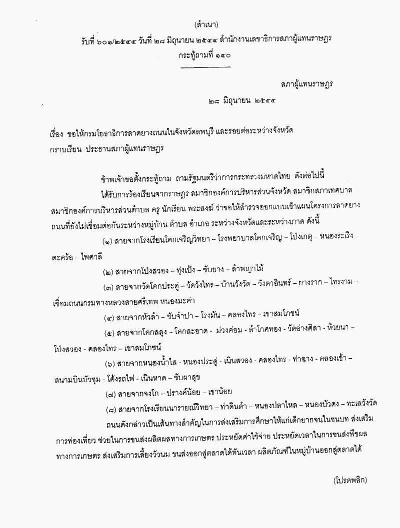 ขอให้กรมโยธาธิการลาดยางถนนในจังหวัดลพบุรี และรอยต่อระหว่างจังหวัด |