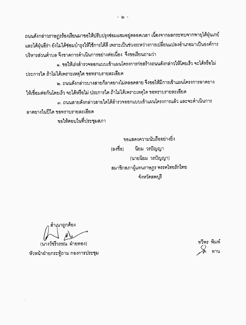 • กระทู้ถามที่ 140 เรื่อง ขอให้กรมโยธาธิการลาดยางถนนในจังหวัดลพบุรี และรอยต่อระหว่างจังหวัด นายนิยม วรปัญญา เป็นผู้ตั้งกระทู้ถาม ถามรัฐมนตรีว่าการกระทรวงมหาดไทย