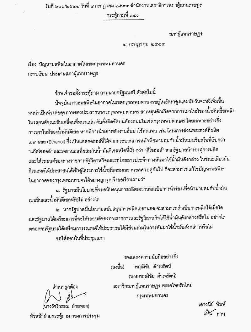 กระทู้ถามที่ 143 เรื่อง ปัญหามลพิษในอากาศในเขตกรุงเทพมหานคร นายพฤฒิชัย ดำรงรัตน์ เป็นผู้ตั้งกระทู้ถาม ถามนายกรัฐมนตรี |