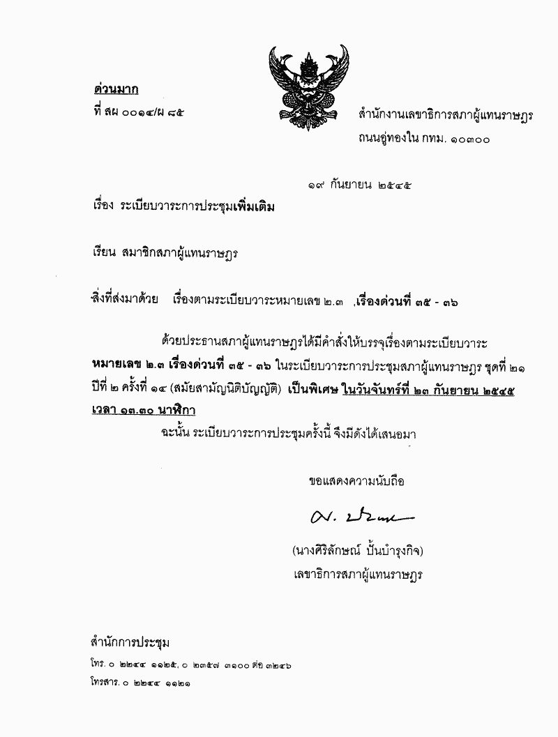 • ระเบียบวาระการประชุมสภาผู้แทนราษฎร ชุดที่ 21 ปีที่ 2 ครั้งที่ 14 (สมัยสามัญนิติบัญญัติ) วันจันทร์ที่ 23 กันยายน 2545