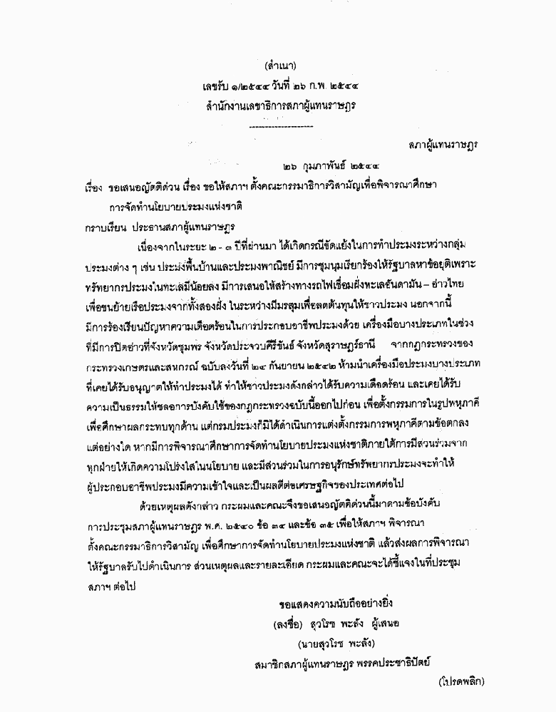 • ขอเสนอญัตติด่วน เรื่อง ขอให้สภาฯ ตั้งคณะกรรมาธิการวิสามัญเพื่อพิจารณาศึกษาการจัดทำนโยบายประมงแห่งชาติ