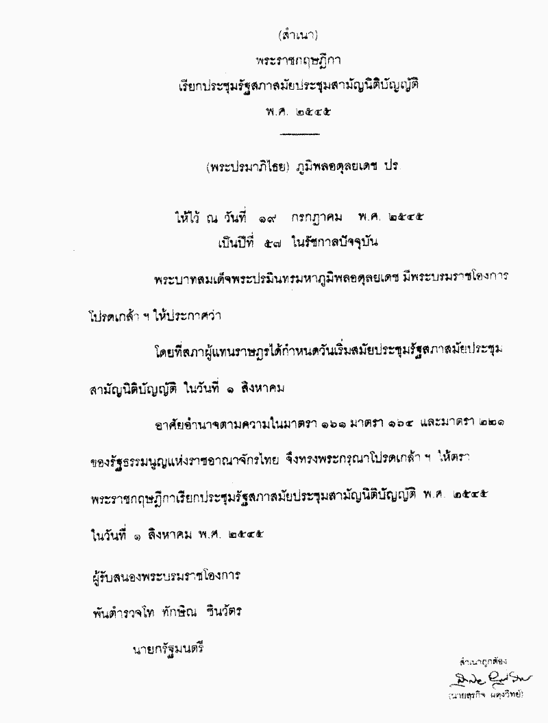 ชื่อเอกสาร : พระราชกฤษฎีกา เรียกประชุมรัฐสภาสมัยประชุมสามัญนิติบัญญัติ พ.ศ. ๒๕๔๕