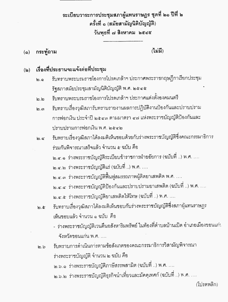 • ระเบียบวาระการประชุมสภาผู้แทนราษฎร ชุดที่ ๒๑ ปีที่ ๒ ครั้งที่ ๑ (สมัยสามัญนิติบัญญัติ) วันพุธที่ ๗ สิงหาคม ๒๕๔๕