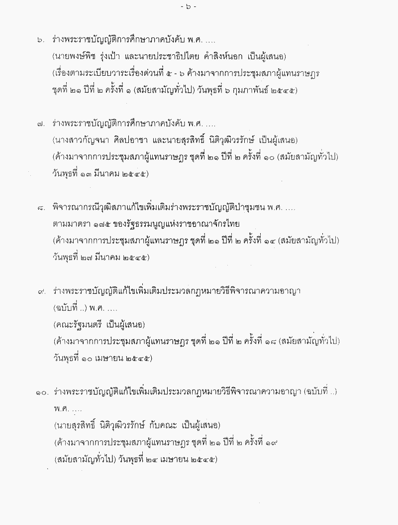 • ระเบียบวาระการประชุมสภาผู้แทนราษฎร ชุดที่ ๒๑ ปีที่ ๒ ครั้งที่ ๑ (สมัยสามัญนิติบัญญัติ) วันพุธที่ ๗ สิงหาคม ๒๕๔๕