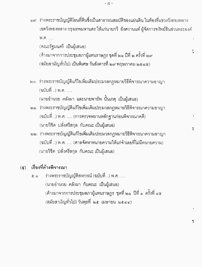 • ระเบียบวาระการประชุมสภาผู้แทนราษฎร ชุดที่ ๒๑ ปีที่ ๒ ครั้งที่ ๑ (สมัยสามัญนิติบัญญัติ) วันพุธที่ ๗ สิงหาคม ๒๕๔๕