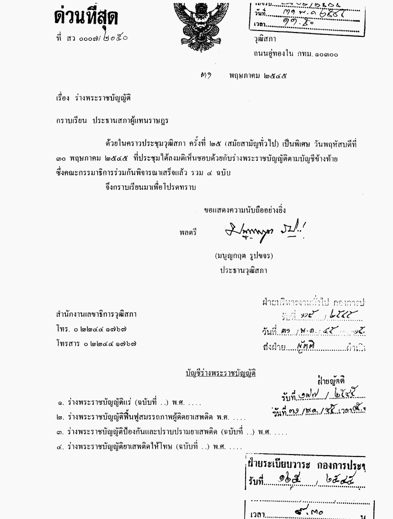 ร่างพระราชบัญญัติ แร่ (ฉบับที่ ..) พ.ศ. .... ร่างพระราชบัญญัติฟื้นฟูสมรรถภาพผู้ติดยาเสพติด พ.ศ..... ร่างพระราชบัญญัติป้องกันและปราบปรามยาเสพติด (ฉบับที่..) พ.ศ..... ร่างพระราชบัณญัติยาเสพติดให้โทษ (ฉบับที่..) พ.ศ .... |