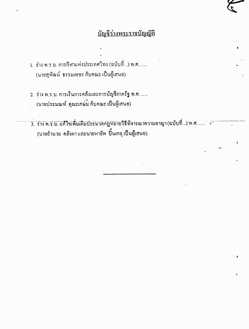 • ร่างพระราชบัญญัติการกีฬาแห่งประเทศไทย (ฉบับที่ ..) พ.ศ.....(นายสุพัฒน์ ธรรมเพชร กับคณะ เป็นผู้เสนอ) ร่างพระราชบัญญัติการเงินการคลังและการบัญชีภาครัฐ พ.ศ.... (นายประมณฑ์ คุณะเกษม กับคณะ เป็นผู้เสนอ)