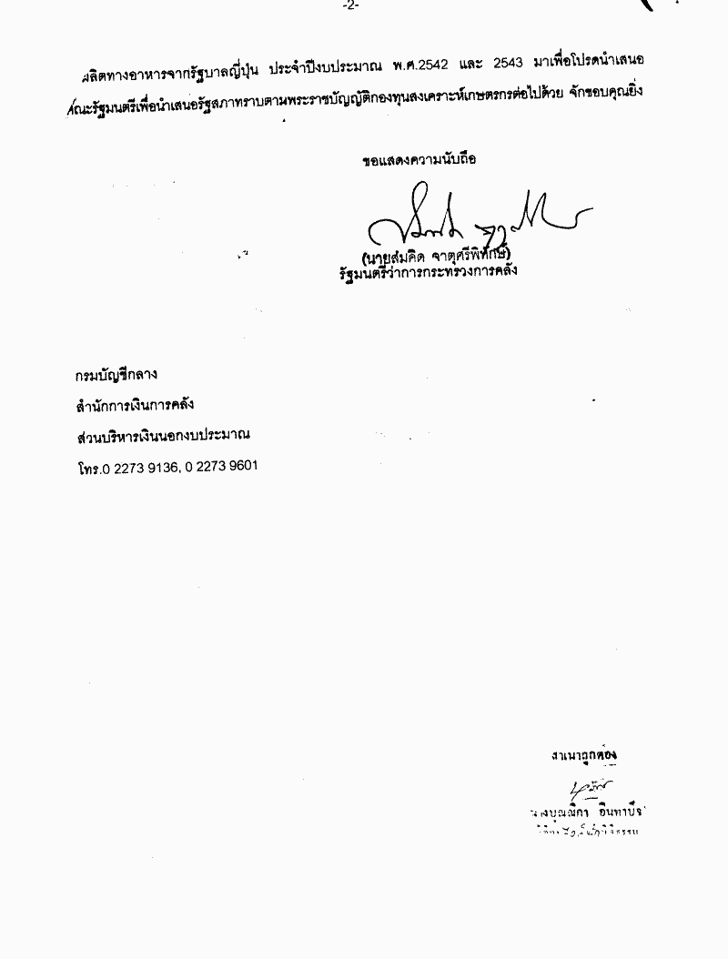 • รับทราบรายงานผลการตรวจสอบรายงานการรับ-จ่ายเงินของกองทุนสงเคราะห์เกษตรกรและเงินกองทุนหมุนเวียนสำหรับอุดหนุนเกษตรกรในการหาปัจจัยการผลิตตามโครงการความช่วยเหลือเพื่อเพิ่มผลผลิตทางอาหารจากรัฐบาลญี่ปุ่น ประจำปีงบประมาณ พ.ศ. 2542 และ 2543