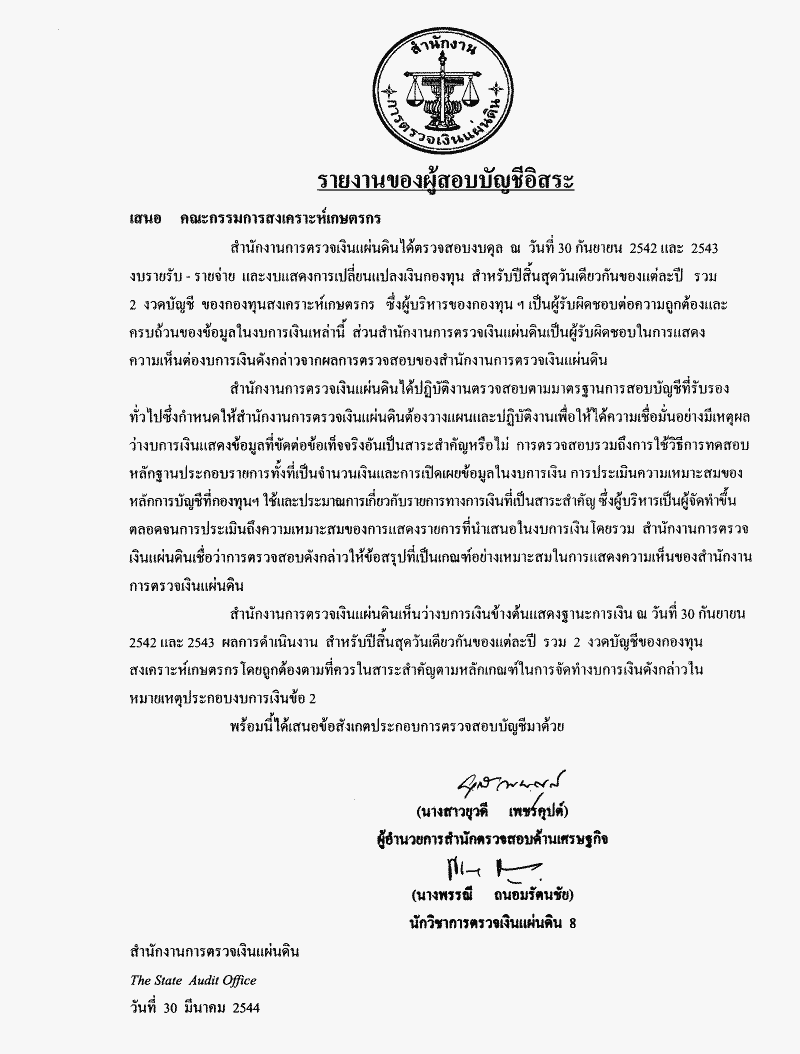 • รายงานผลการตรวจสอบรายงานการรับ-จ่ายเงินของกองทุนสงเคราะห์เกษตรกรและเงินกองทุนหมุนเวียนสำหรับอุดหนุนเกษตรกรในการหาปัจจัยการผลิตตามโครงการความช่วยเหลือเพื่อเพิ่มผลผลิตทางอาหารจากรัฐบาลญี่ปุ่น ประจำปีงบประมาณ พ.ศ. 2542 และ 2543
