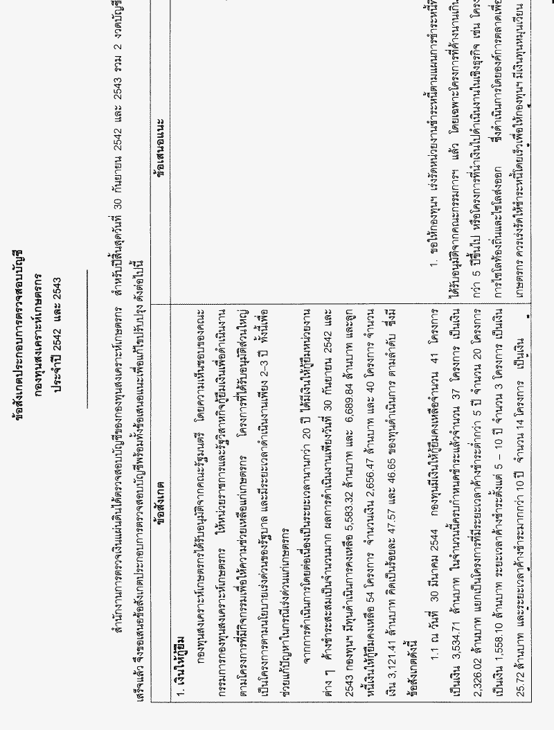 • รายงานผลการตรวจสอบรายงานการรับ-จ่ายเงินของกองทุนสงเคราะห์เกษตรกรและเงินกองทุนหมุนเวียนสำหรับอุดหนุนเกษตรกรในการหาปัจจัยการผลิตตามโครงการความช่วยเหลือเพื่อเพิ่มผลผลิตทางอาหารจากรัฐบาลญี่ปุ่น ประจำปีงบประมาณ พ.ศ. 2542 และ 2543