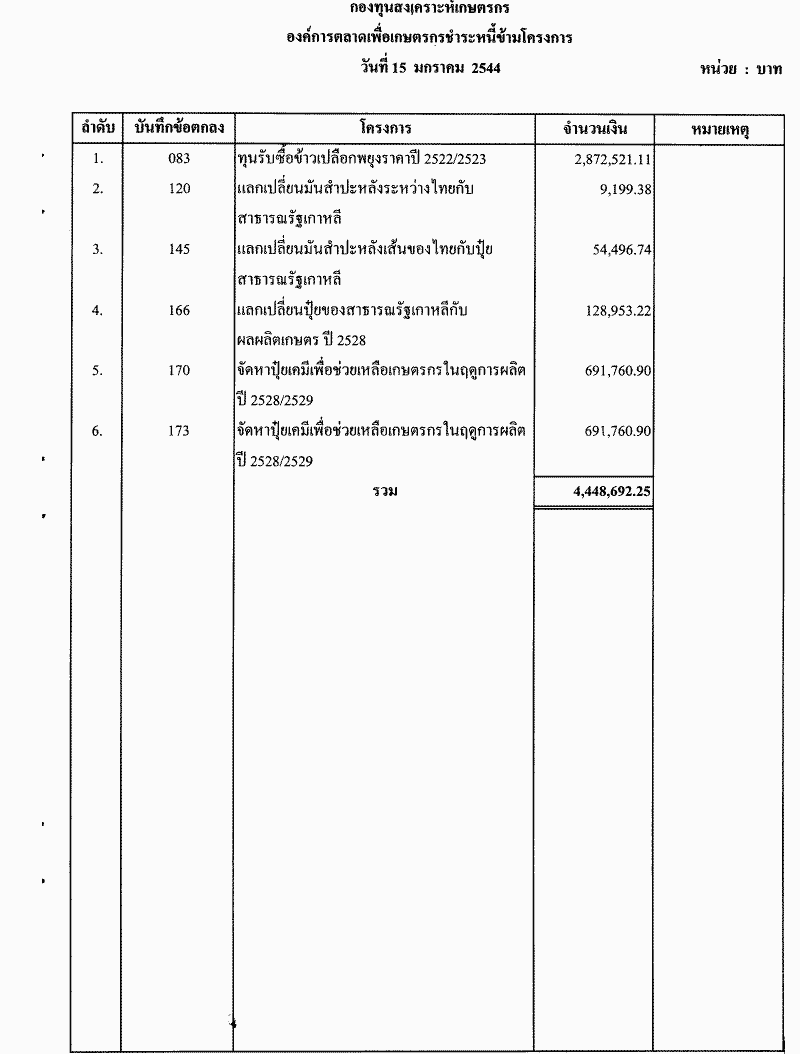 • รับทราบรายงานผลการตรวจสอบรายงานการรับ-จ่ายเงินของกองทุนสงเคราะห์เกษตรกรและเงินกองทุนหมุนเวียนสำหรับอุดหนุนเกษตรกรในการหาปัจจัยการผลิตตามโครงการความช่วยเหลือเพื่อเพิ่มผลผลิตทางอาหารจากรัฐบาลญี่ปุ่น ประจำปีงบประมาณ พ.ศ. 2542 และ 2543