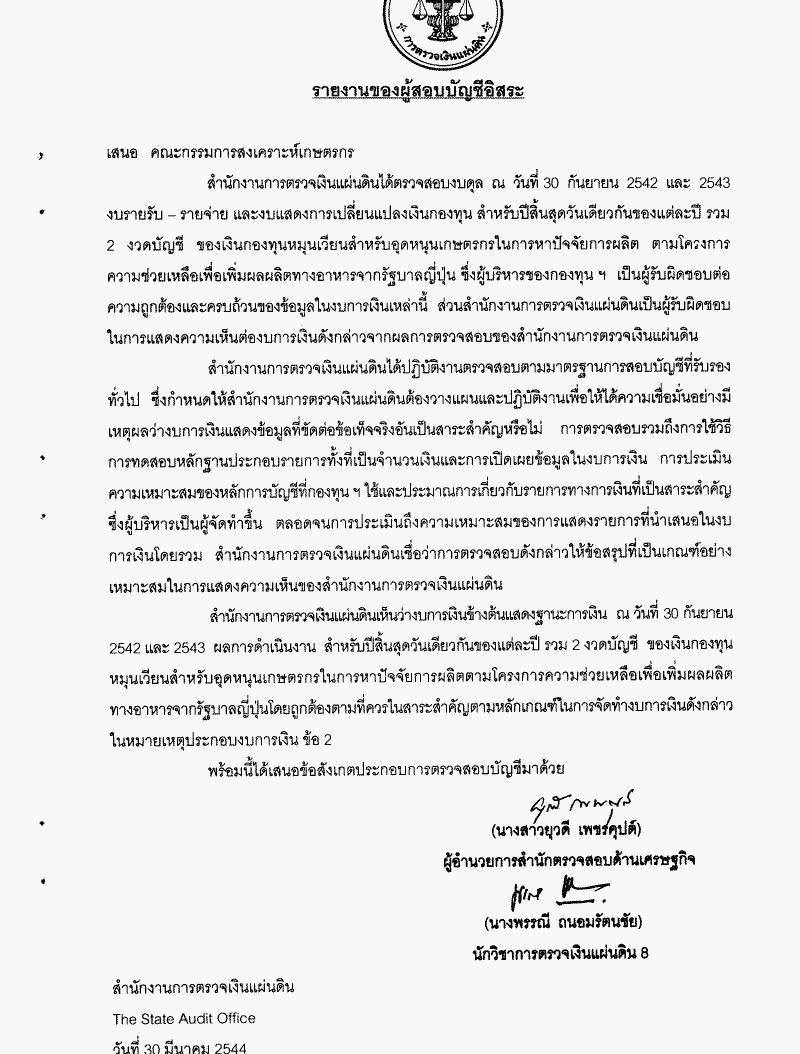 • รายงานผลการตรวจสอบรายงานการรับ-จ่ายเงินของกองทุนสงเคราะห์เกษตรกรและเงินกองทุนหมุนเวียนสำหรับอุดหนุนเกษตรกรในการหาปัจจัยการผลิตตามโครงการความช่วยเหลือเพื่อเพิ่มผลผลิตทางอาหารจากรัฐบาลญี่ปุ่น ประจำปีงบประมาณ พ.ศ. 2542 และ 2543