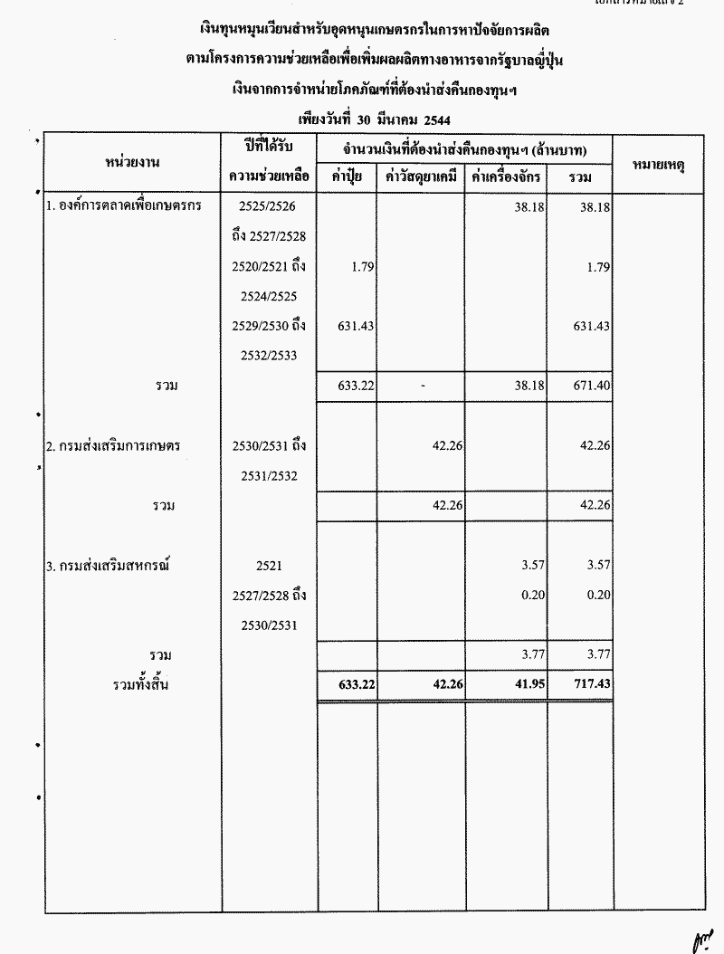 • รับทราบรายงานผลการตรวจสอบรายงานการรับ-จ่ายเงินของกองทุนสงเคราะห์เกษตรกรและเงินกองทุนหมุนเวียนสำหรับอุดหนุนเกษตรกรในการหาปัจจัยการผลิตตามโครงการความช่วยเหลือเพื่อเพิ่มผลผลิตทางอาหารจากรัฐบาลญี่ปุ่น ประจำปีงบประมาณ พ.ศ. 2542 และ 2543