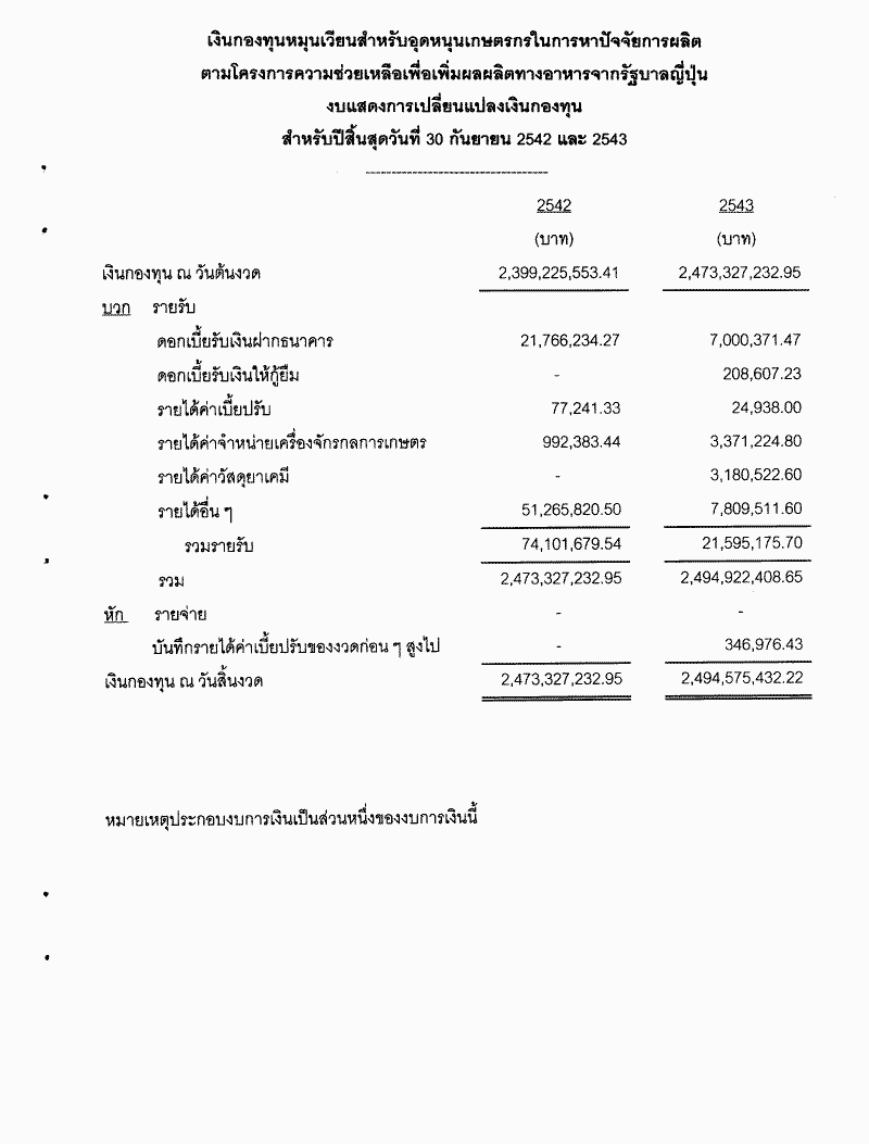 • รายงานผลการตรวจสอบรายงานการรับ-จ่ายเงินของกองทุนสงเคราะห์เกษตรกรและเงินกองทุนหมุนเวียนสำหรับอุดหนุนเกษตรกรในการหาปัจจัยการผลิตตามโครงการความช่วยเหลือเพื่อเพิ่มผลผลิตทางอาหารจากรัฐบาลญี่ปุ่น ประจำปีงบประมาณ พ.ศ. 2542 และ 2543