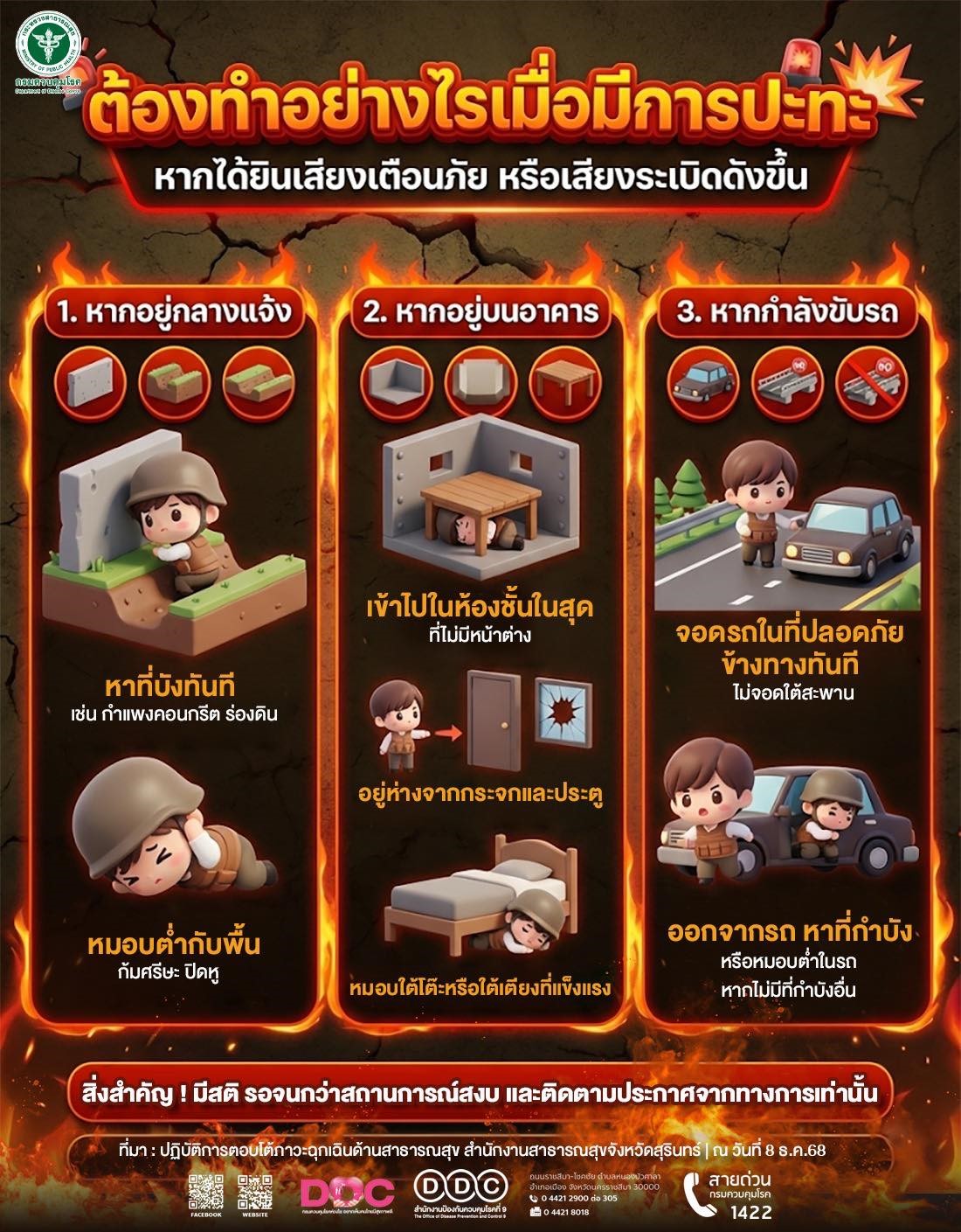 สุเมฆ 6812 D ทำอย่างไรเมื่อมีการปะทะ หากได้ยินเสียงเตือนภัย หรือเสียงระเบิดดังขึ้น |