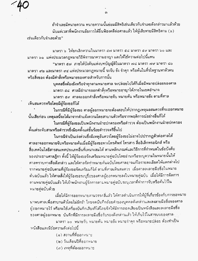 ชื่อเอกสาร :   ร่างพระราชบัญญัติแก้ไขเพิ่มเติมประมวลกฎหมายวิธีพิจารณาความอาญา(ฉบับที่..) พ. ศ..... (นายอำนวย คลังผา และนายพายัพ ปั้นเกตุ เป็นผู้เสนอ)