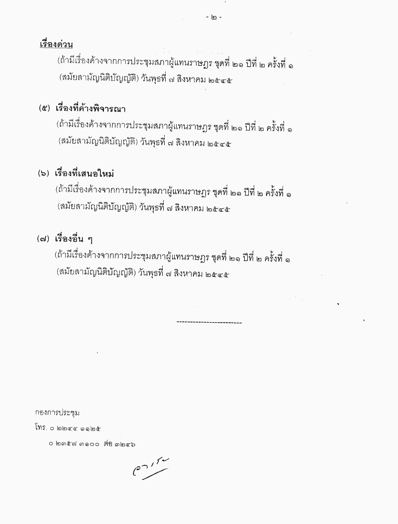 • ระเบียบวาระการประชุมสภาผู้แทนราษฎร ชุดที่ 21 ปีที่ 2 ครั้งที่ 2 (สมัยสามัญนิติบัญญัติ) วันพฤหัสบดีที่ 8 สิงหาคม 2545