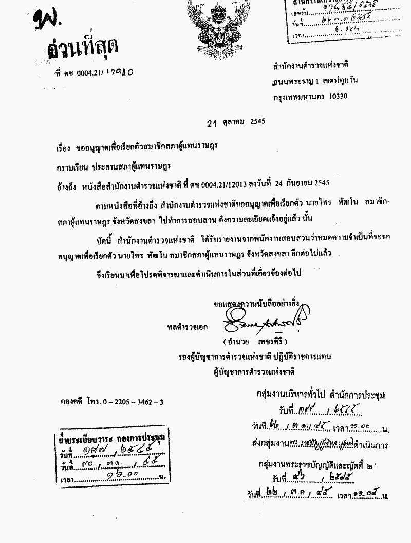 รับทราบเรื่องให้นำเรื่องขออนุญาตสภาผู้แทนราษฎรเรียกตัว นายไพร พัฒโน สมาชิกสภาผู้แทนราษฎรไปทำการสอบสวนในคดีอาญา ในระหว่างสมัยประชุมตามมาตรา 165 ของรัฐธรรมนูญแห่งราชอาณาจักรไทย ออกจากระเบียบวาระการประชุมตามข้อบังคับฯ ข้อ 57 |