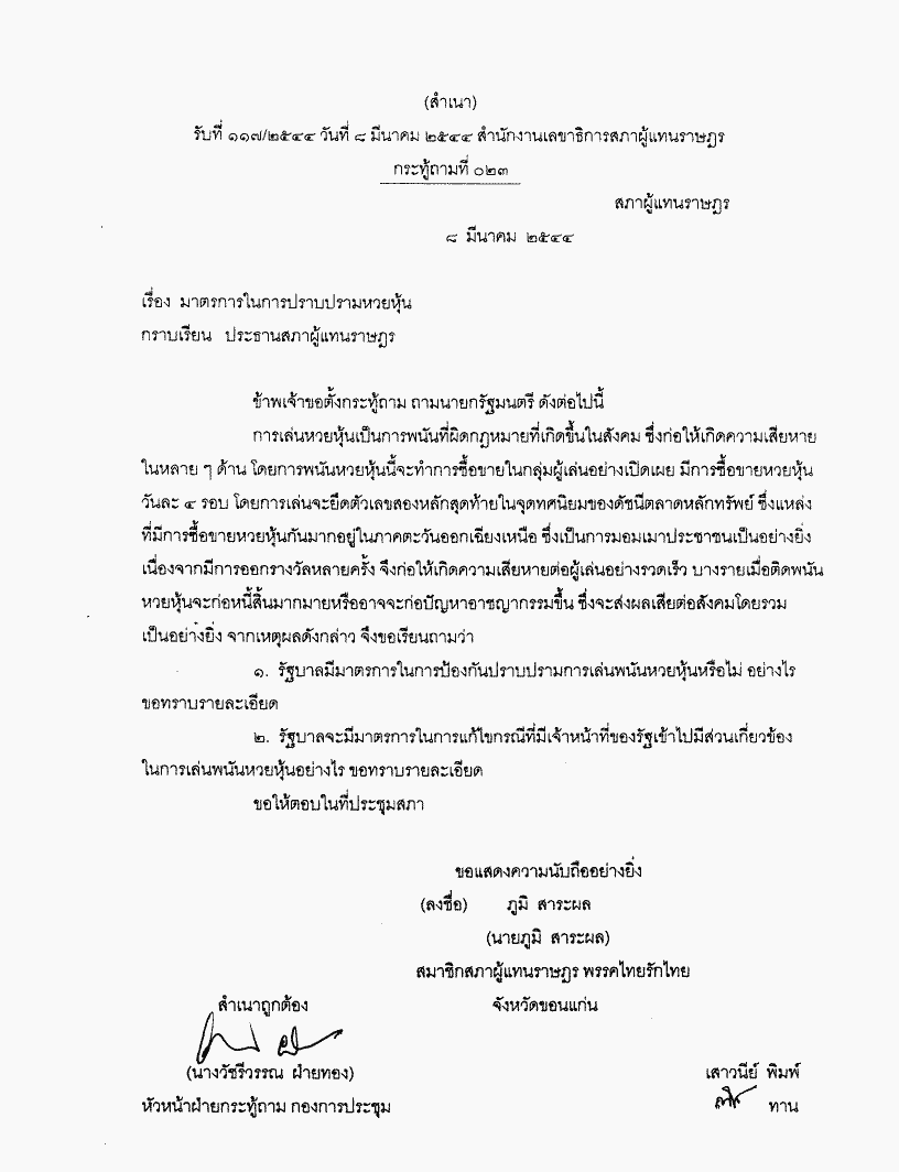 กระทู้ถาม เรื่อง มาตรการในการปราบปรามหวยหุ้น นายภูมิ สาระผล เป็นผู้ตั้งกระทู้ถาม ถามนายกรัฐมนตรี |