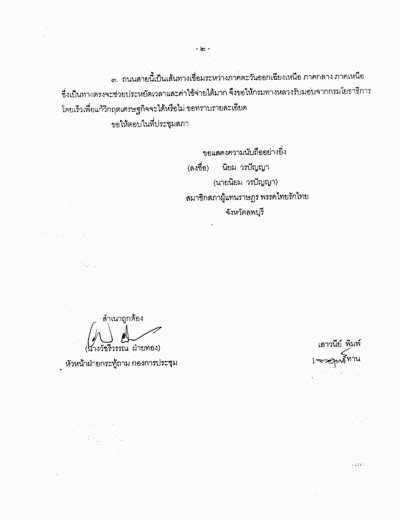กระทู้ถาม เรื่อง ปัญหาความล่าช้าในการรับโอนถนนช่วงโคกเจิรญ - ตะคร้อ นายนิยม วรปัญญา เป็นผู้ตั้งกระทู้ถาม ถามนายกรัฐมนตรี |
