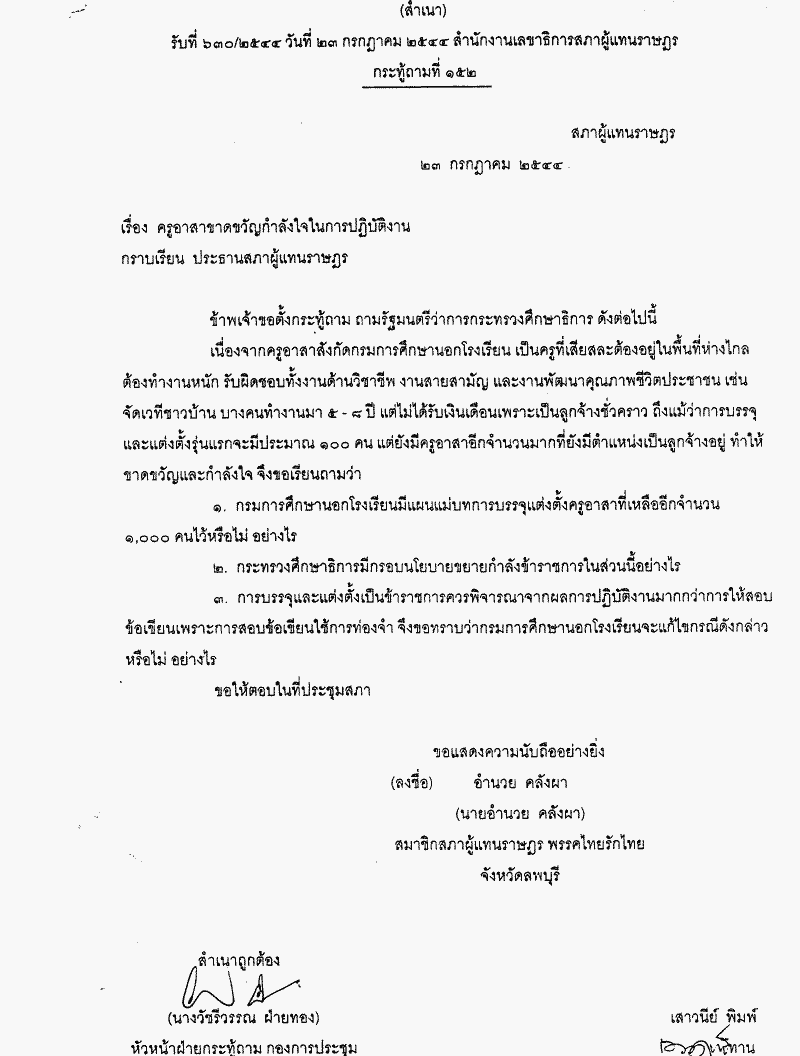 กระทู้ถามที่ 152 เรื่อง ครูอาสาขาดขวัญกำลังใจในการปฏิบัติงาน นายอำนวย คลังผา เป็นผู้ตั้งกระทู้ถาม ถามรัฐมนตรีว่าการกระทรวงศึกษาธิการ |