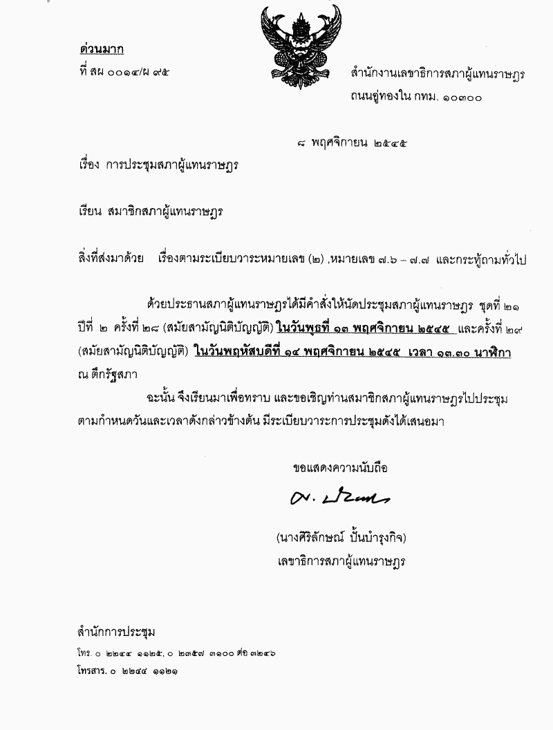 • ระเบียบวาระการประชุมสภาผู้แทนราษฎร ชุดที่ 21 ปีที่ 2 ครั้งที่ 28 (สมัยสามัญนิติบัญญัติ) วันพุธที่ 13 พฤศจิกายน 2545