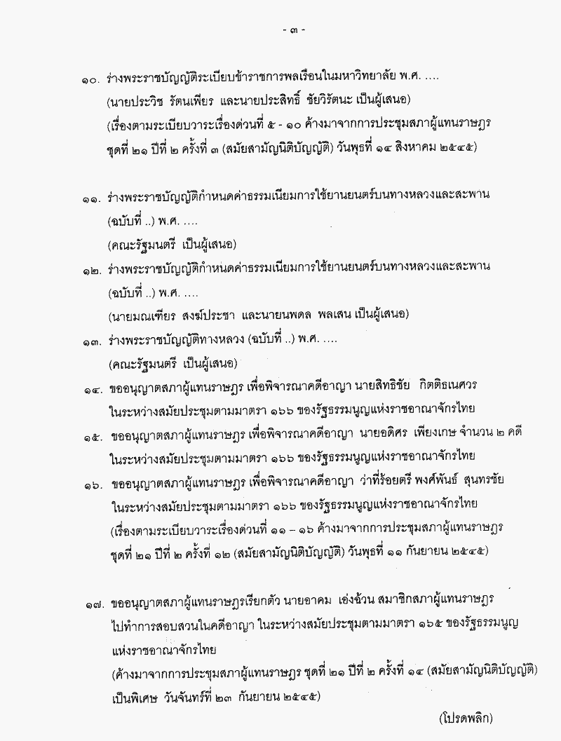 • ระเบียบวาระการประชุมสภาผู้แทนราษฎร ชุดที่ 21 ปีที่ 2 ครั้งที่ 28 (สมัยสามัญนิติบัญญัติ) วันพุธที่ 13 พฤศจิกายน 2545