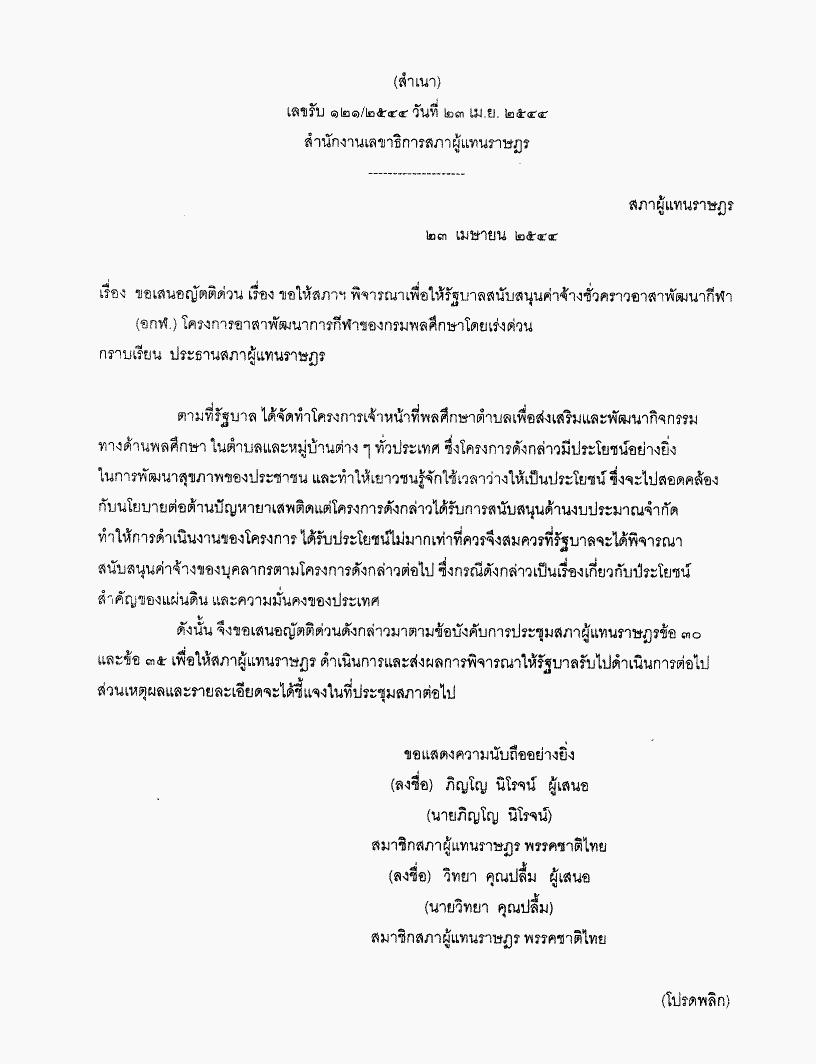 ญัตติ เรื่อง ขอให้สภาฯ พิจารณาเพื่อให้รัฐบาลสนับสนุนค่าจ้างชั่วคราวอาสาพัฒนากีฬา(อกฬ.) โครงการอาสาพัฒนาการกีฬาของกรมพลศึกษาโดยเร่งด่วน (นายภิญโญ นิโรจน์ และนายวิทยา คุณปลื้ม เป็นผู้เสนอ) |