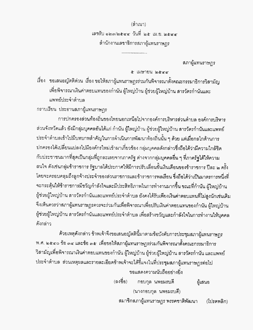 ขอเสนอญัตติด่วน เรื่อง ขอให้สภาผู้แทนราษฎรร่วมกันพิจารณาตั้งคณะกรรมาธิการวิสามัญเพื่อพิจารณาเงินค่าตอบแทนของกำนัน ผู้ใหญ่บ้าน ผู้ช่วยผู้ใหญ่บ้าน สารวัตรกำนันและแพทย์ประจำตำบล |