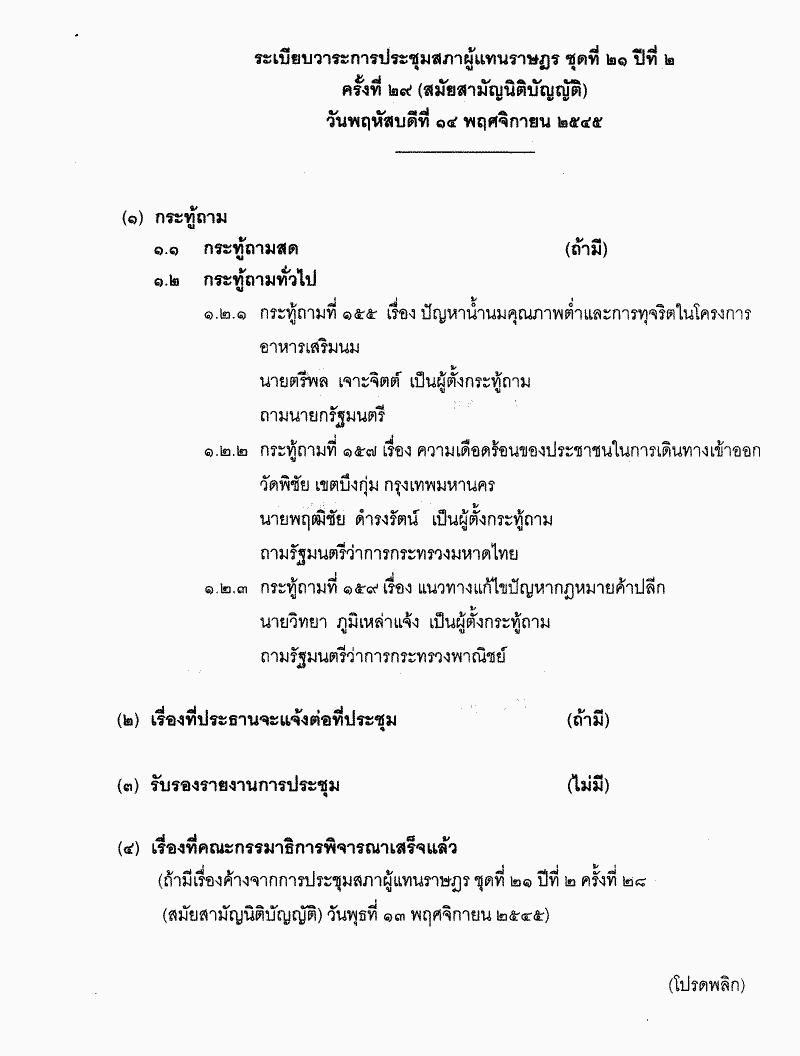 ชื่อเอกสาร : ระเบียบวาระการประชุมสภาผู้แทนราษฎร ชุดที่ 21 ปีที่ 2 ครั้งที่ 29 (สมัยสามัญนิติบัญญัติ) วันพฤหัสบดีที่ 14 พฤศจิกายน 2545