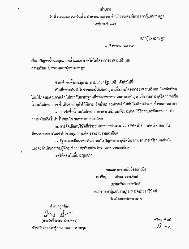 กระทู้ถามที่ 155 เรื่อง ปัญหาน้ำนมคุณภาพต่ำและการทุจริตในโครงการอาหารเสริมนม นายตรีพล เจาะจิตต์ เป็นผู้ตั้งกระทู้ถาม ถามนายกรัฐมนตรี |