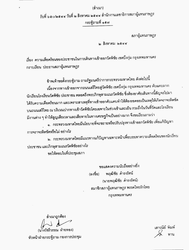 กระทู้ถามที่ 157 เรื่อง ความเดือดร้อนของประชาชนในการเดินทางเข้าออกวัดพิชัย เขตบึงกุ่ม กรุงเทพมหานคร นายพฤฒิชัย ดำรงรัตน์ เป็นผู้ตั้งกระทู้ถาม ถามรัฐมนตรีว่าการกระทรวงมหาดไทย |