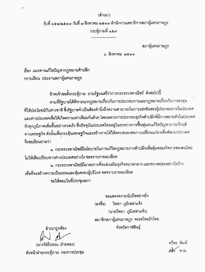 กระทู้ถามที่ 159 เรื่อง แนวทางแก้ไขปัญหากฎหมายค้าปลีก นายวิทยา ภูมิเหล่าแจ้ง เป็นผู้ตั้งกระทู้ถาม ถามรัฐมนตรีว่าการกระทรวงพาณิชย์ |