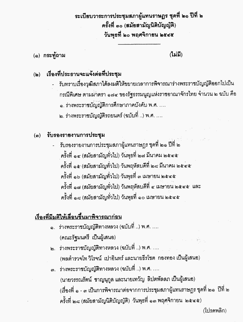 ระเบียบวาระการประชุมสภาผู้แทนราษฎร ชุดที่ 21 ปีที่ 2 ครั้งที่ 30 (สมัยสามัญนิติบัญญัติ) วันพุธที่ 20 พฤศจิกายน 2545 |