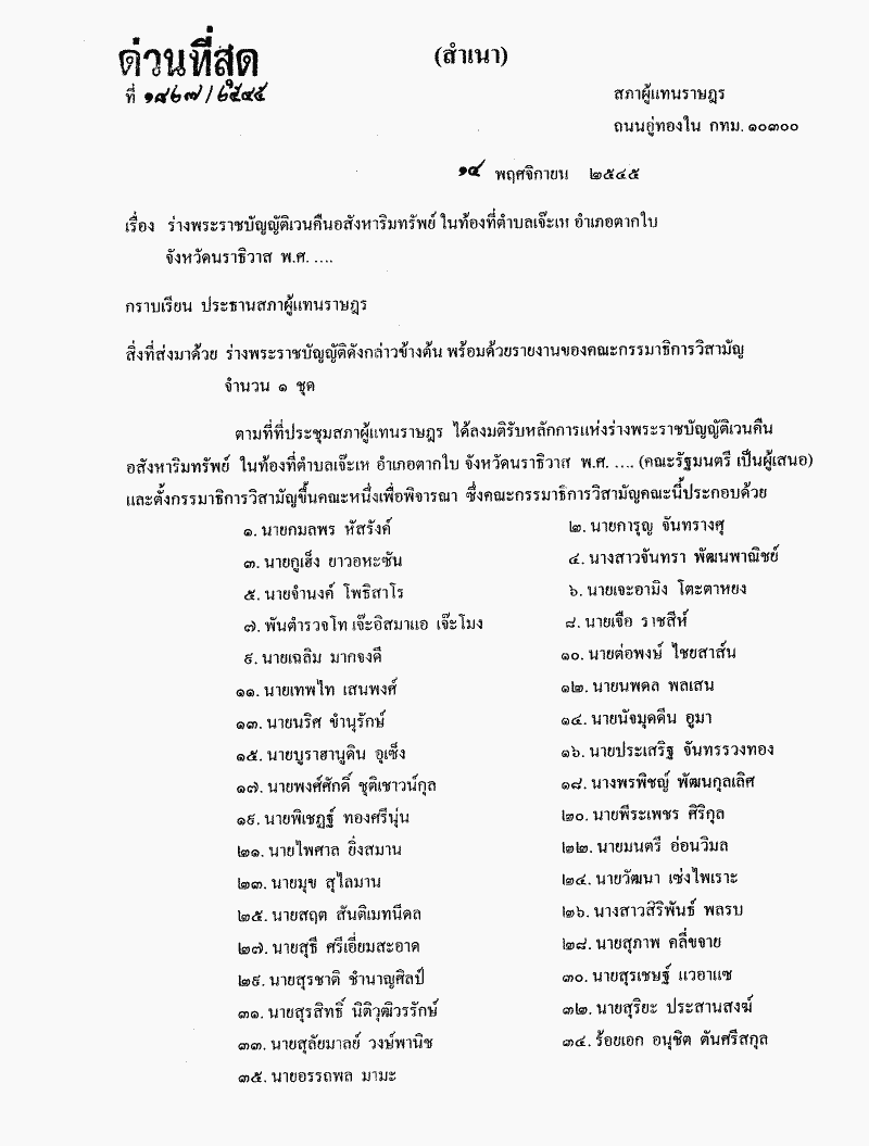 • ร่างพระราชบัญญัติเวนคืนอสังหาริมทรัพย์ในท้องที่ตำบลเจ๊ะเห อำเภอตากใบจังหวัดนราธิวาส พ.ศ. .....
